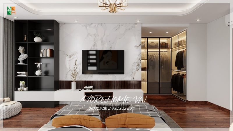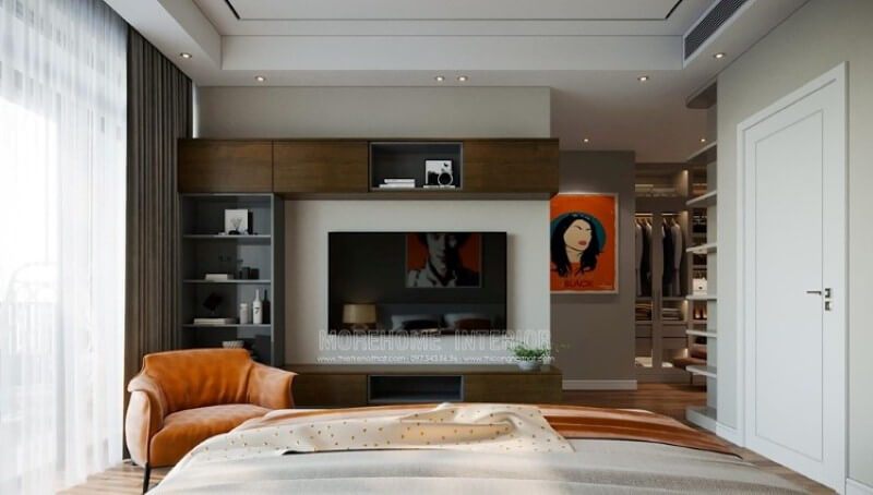 Thiết kế phòng ngủ thông với không gian để đồ, quần áo tiện lợi và tạo sự liền mạch rộng rãi phù hợp cho cả biệt thự, chung cư cao cấp hay nhà phố