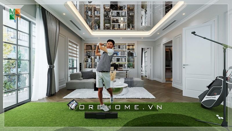 Phòng khách biệt thự, nhà phố được thiết kế độc đáo mới lạ khi bố trí sofa vải tiện lợi và sân golf nhỏ hiện đại.