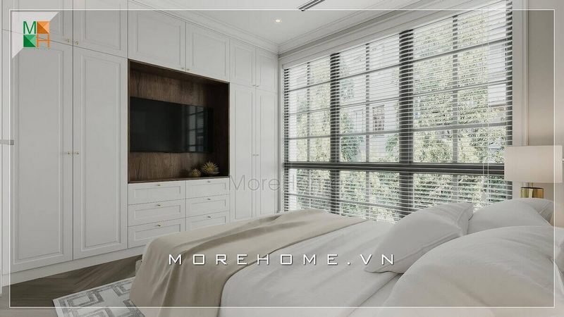 Phòng ngủ hiện đại trong thiết kế biệt thự gây ấn tượng với sắc trắng trẻ trung và hệ thống tủ âm tường tiện lợi.