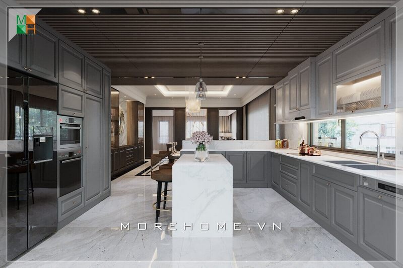 Mẫu thiết kế không gian bếp hiện đại nổi bật với gam màu xám ghi sang trọng cho biệt thự, nhà phố.