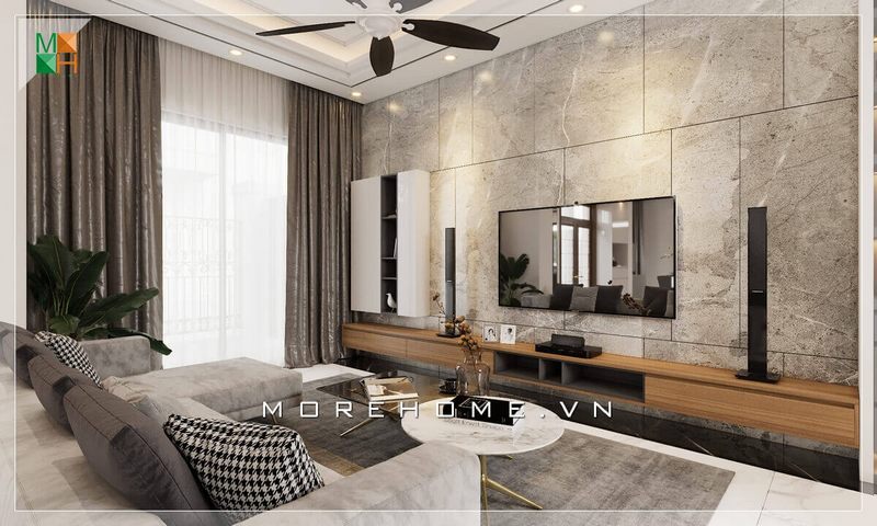 Một phòng khách sang trọng phụ thuộc vào nhiều yếu tố tạo thành trong đó cách bày trí đá ốp vách tivi vân mây tạo điểm nhấn mạnh mẽ sức hút hiện đại cho phòng khách