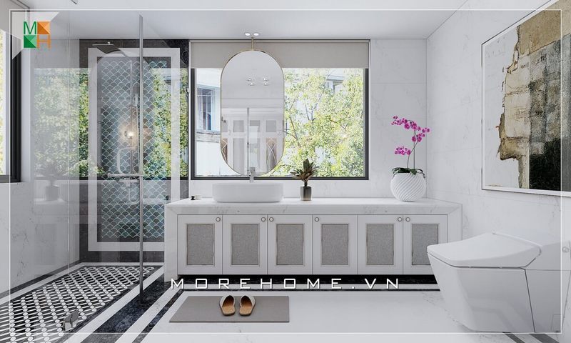 Thiết kế phòng tắm tông màu trắng tinh tế mang phong cách hiện đại giúp gia chủ có không gian thư giãn sau những giờ làm việc căng thẳng